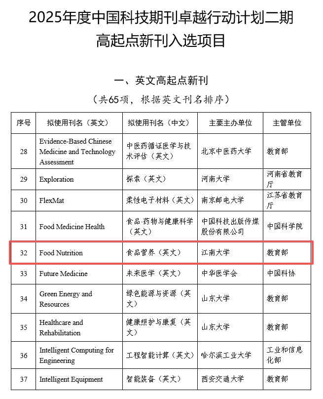 主办的英文开放获取期刊《食品营养(英文)》(Food Nutrition)成功入选。这是Food Nutrition在创刊首年获得的一项重要国家级项目支持,标志着期刊的学术定位与发展潜力获得学界与科技出版界的高度认可。